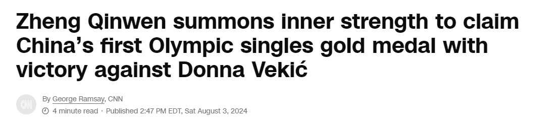 北京时间8月4日凌晨,巴黎奥运会女子网球单打决赛中,中国选手郑钦文2-0击败克罗地亚选手维基奇夺得冠军。美国媒体CNN报道,郑钦文鼓足内心力量,战胜维基奇,夺得中国首枚奥运女子网球单打金牌。