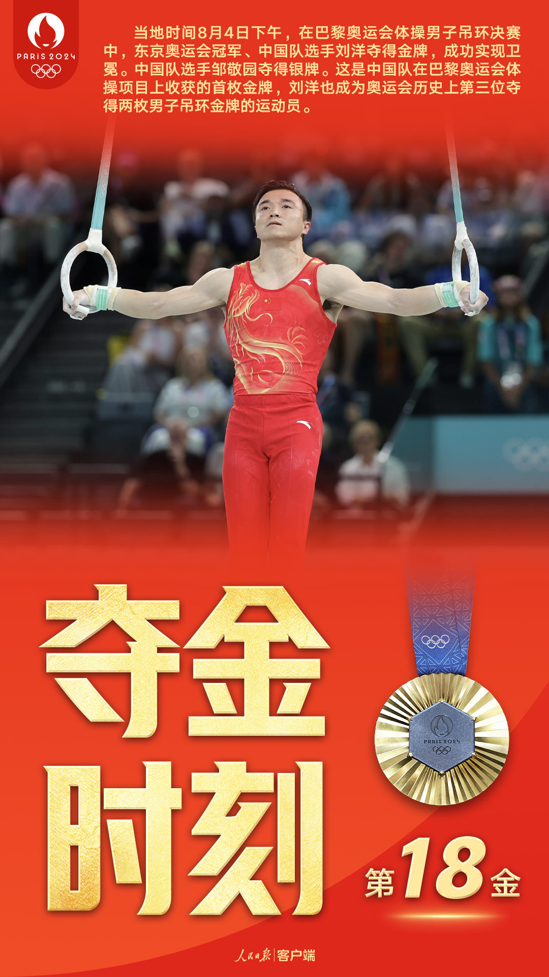 这是中国队在巴黎奥运会体操项目上收获的首枚金牌,刘洋也成为了奥运会历史上第三位夺得两枚男子吊环金牌的运动员。