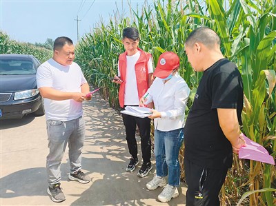 刘亚(左)和县农资种子公司工作人员一起查看玉米的生长情况。郭任义摄
