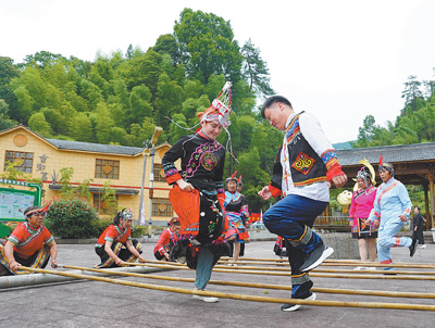 江西鹰潭贵溪市樟坪畲族乡位于大山深处,生态环境优越,该乡将畲乡文化与森林康养旅游结合起来,打造独具特色的畲乡文旅健康游,吸引了众多游客前来“打卡”体验。图为游客正与当地居民一起开心跳起竹竿舞。 |