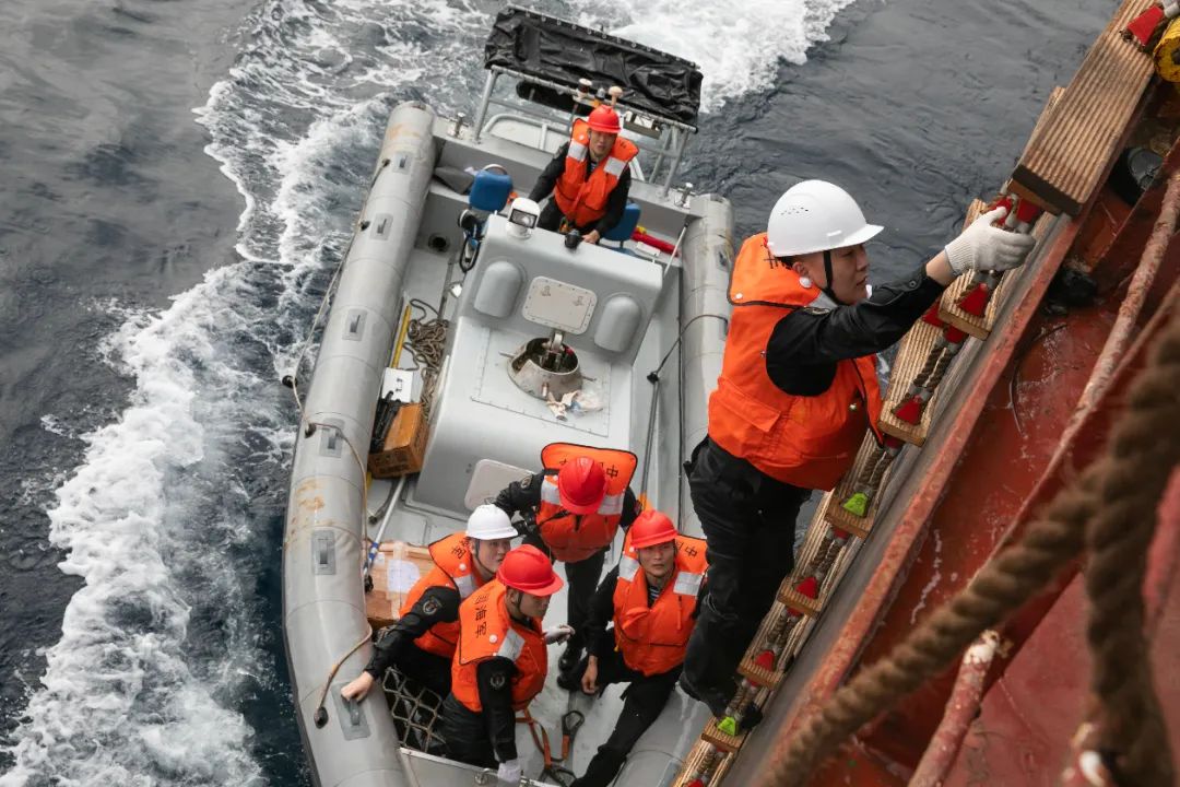 乘坐小艇快速驶向“嘉德长和”号商船