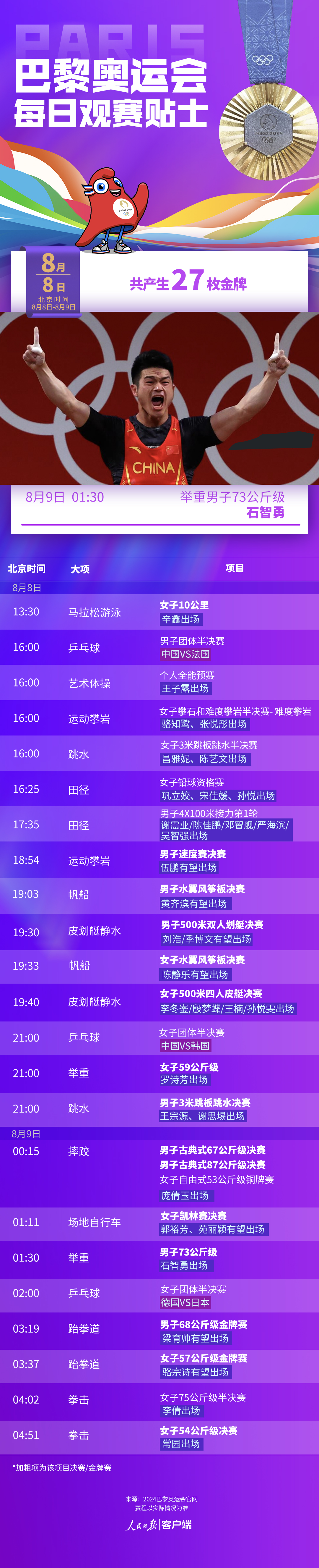 巴黎时间8月8日,巴黎奥运会将在马拉松游泳、跳水、举重、攀岩等项目共产生27枚金牌。王宗源、谢思埸将携手决战跳水男子三米板,力争“包揽金银”,石智勇、罗诗芳将分别在举重男子73公斤级和女子59公斤级比赛中冲击金牌,谢震业领衔“新生代”亮相男子4x100米接力第一轮比赛。这些看点,值得关注!