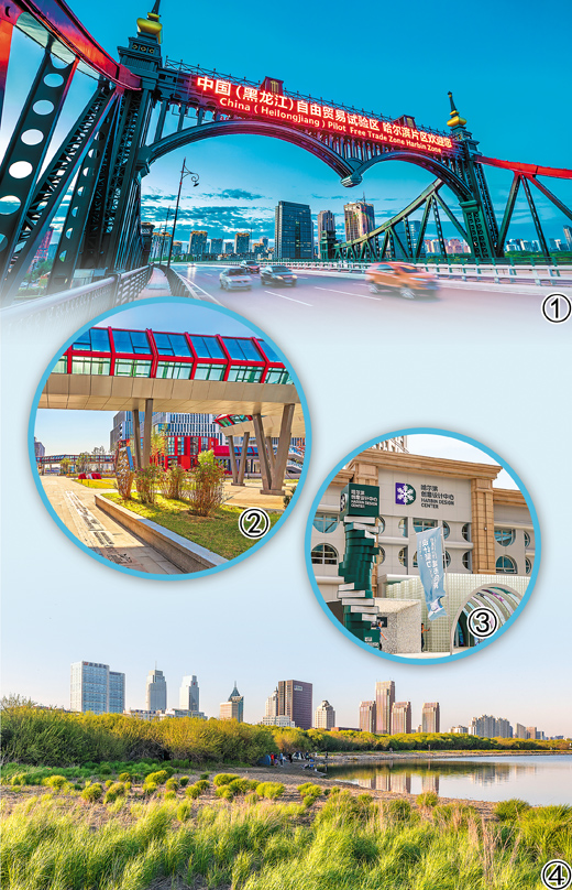 图①:中国(黑龙江)自由贸易试验区哈尔滨片区。 门 奎摄 图②:深哈产业园里的红色廊道。 张本盛摄 图③:哈尔滨创意设计中心。 资料图片 图④:哈尔滨金河湾湿地公园。 张本盛摄