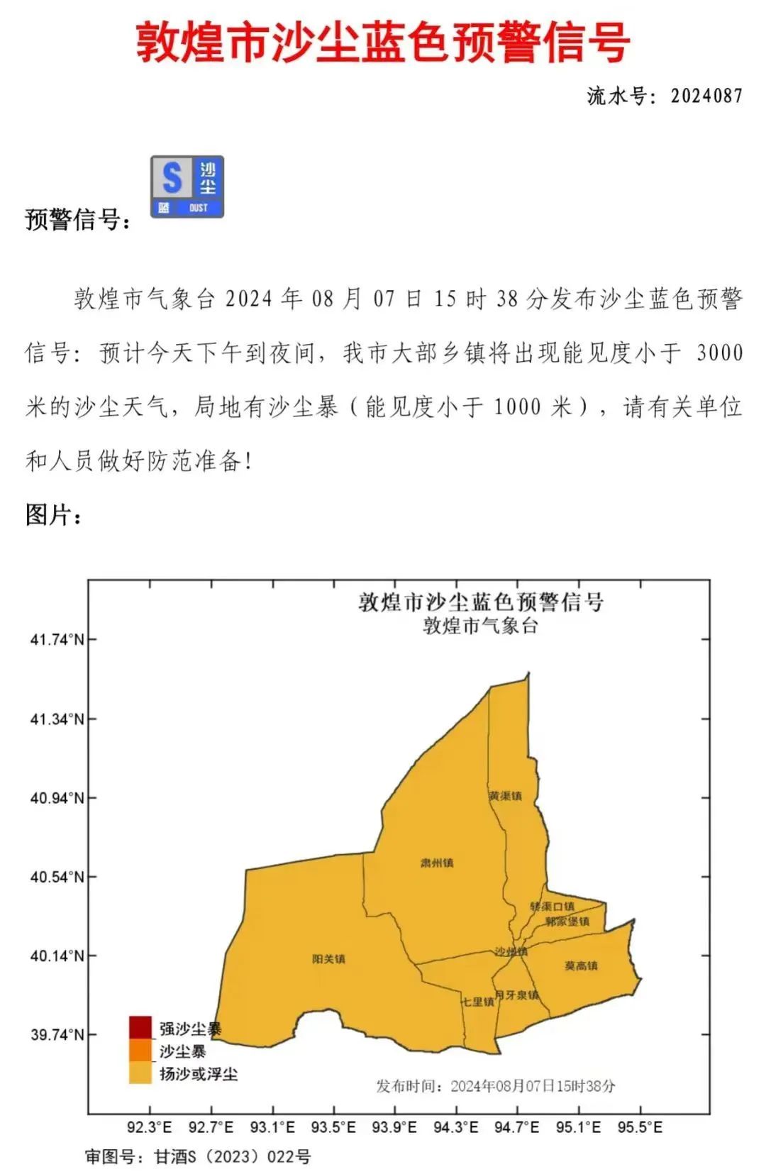 此前,敦煌市气象台曾发布沙尘蓝色预警信号。