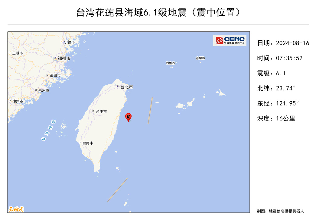 中国地震台网正式测定:08月16日07时35分在台湾花莲县海域(北纬23.74度,东经121.95度)发生6.1级地震,震源深度16千米。