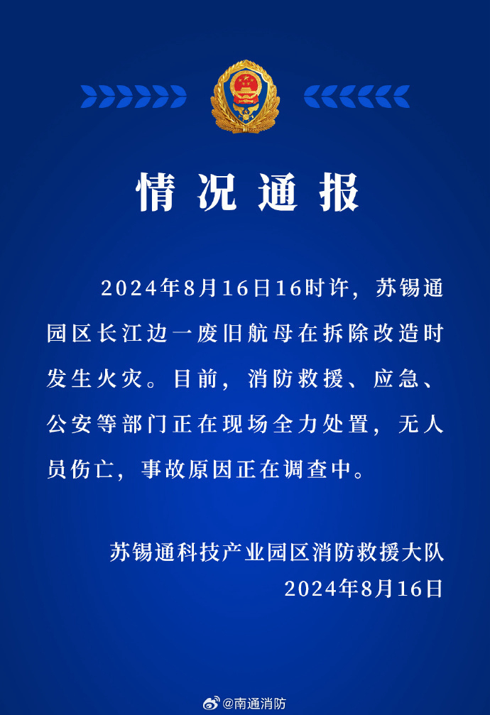 据江苏省南通市消防救援支队官方微博,2024年8月16日16时许,苏锡通园区长江边一废旧航母在拆除改造时发生火灾。目前,消防救援、应急、公安等部门正在现场全力处置,无人员伤亡,事故原因正在调查中。