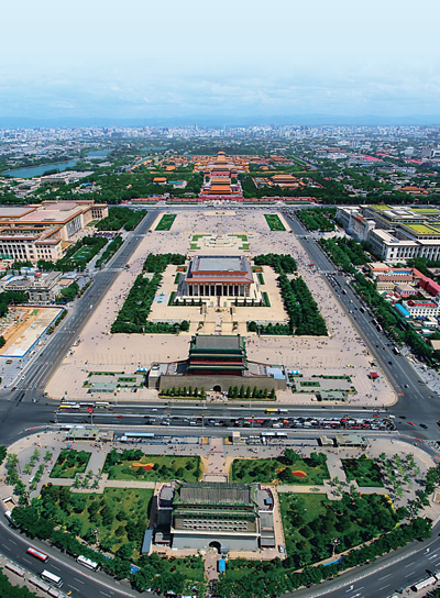 1949年中华人民共和国成立,在位于北京中轴线上的天安门广场举行了盛大的庆祝仪式,天安门广场成为国家庆典和礼仪活动的场所。1958年在天安门广场建成人民英雄纪念碑,1959年遵循北京中轴线传统的对称原则在天安门广场东西两侧建成中国革命博物馆和中国历史博物馆(现中国国家博物馆)、人民大会堂,1977年毛主席纪念堂落成,天安门广场成为国家礼仪活动的中心,继承了北京中轴线所承载的国家礼仪传统。天安门广场建筑群在规划上尊重和延续了北京中轴线的规划思想,体现了“中”“和”的哲学思想,尊重了“左祖右社”的布局理念,国家最重要的纪念性建筑人民英雄纪念碑和毛主席纪念堂置于中心位置;将阐释中华文明发展历程的中国国家博物馆与祭祀祖先的太庙对应,选址在中轴线东侧;将决定国家重大事务和国家礼仪活动的人民大会堂与古代象征国家的社稷坛相对应,选址于中轴线西侧,又与中国国家博物馆均衡对称,体现了北京中轴线的历史完整性和延续性。