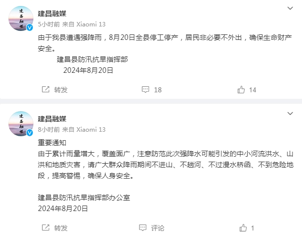 据辽宁省建昌县融媒体中心建昌融媒微博消息,由于建昌县遭遇强降雨,8月20日全县停工停产,居民非必要不外出,确保生命财产安全。由于累计雨量增大,覆盖面广,注意防范此次强降水可能引发的中小河流洪水、山洪和地质灾害,请广大群众降雨期间不进山、不趟河、不过漫水桥函、不到危险地段,提高警惕,确保人身安全。