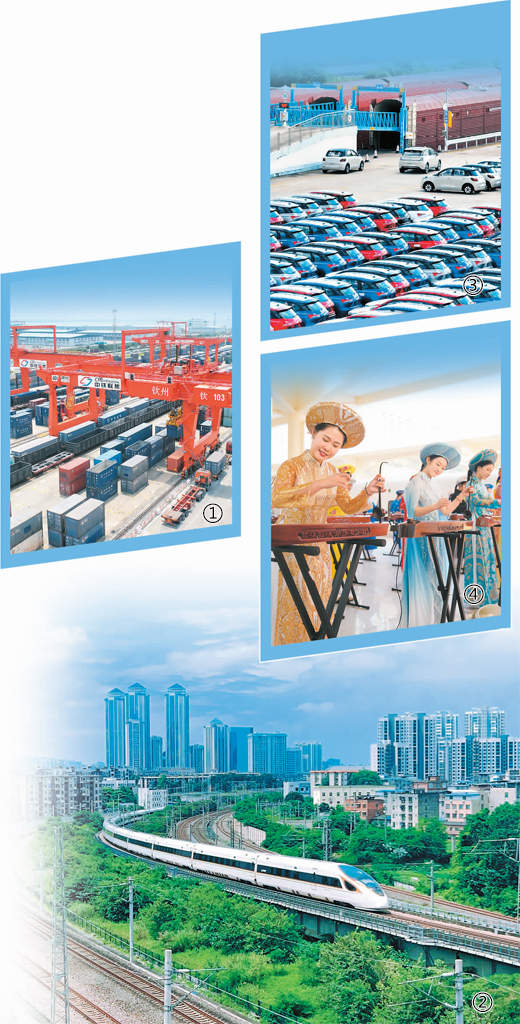图①:在钦州铁路集装箱中心站内,自动化龙门吊正在进行装车作业。 何家海摄 图②:一列复兴号动车组列车行驶在衡柳铁路柳州区段。 杨靖育摄 图③:2014年8月3日,广西柳州雒容汽车物流基地繁忙的装运场景。 黎寒池摄(人民视觉) 图④:2023年12月,防东铁路开通运营。图为京族姑娘在东兴市站站台演奏独弦琴。 蒋 扬摄
