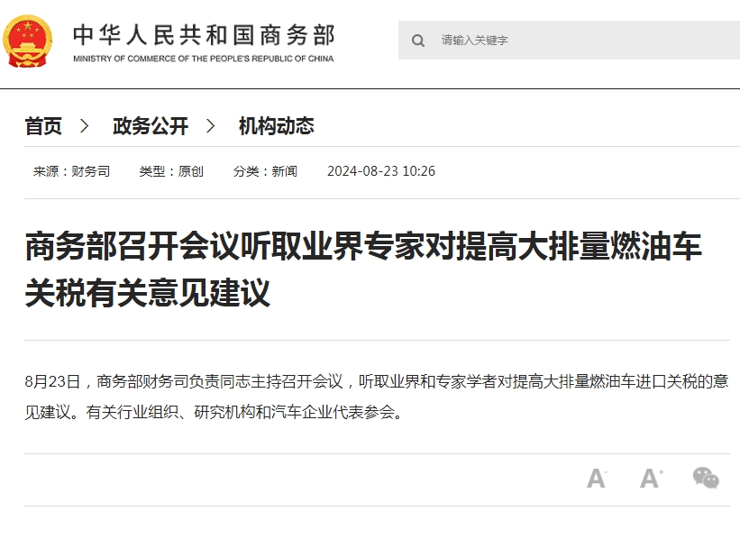 8月23日,商务部财务司负责同志主持召开会议,听取业界和专家学者对提高大排量燃油车进口关税的意见建议。有关行业组织、研究机构和汽车企业代表参会。