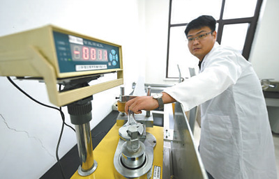 虞城县国家钢卷尺及五金工具质检中心内,工作人员在对扳手类产品进行质量检测。