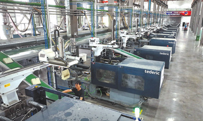 在虞城县亿豪日用品有限责任公司生产车间内,工人在操作注塑机。
