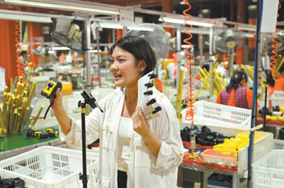 虞城县一家五金企业的生产组装线上,销售人员正在对产品进行直播带货。