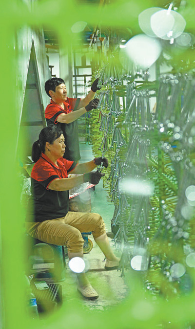 虞城县电镀产业园内,工人在检查电镀好的五金产品零件。