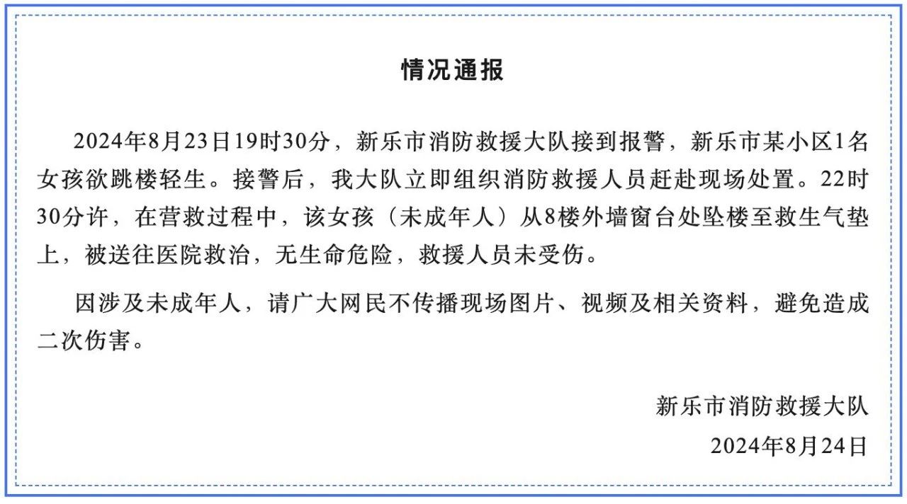 8月24日,新乐市消防救援大队发布情况通报,2024年8月23日19时30分,新乐市消防救援大队接到报警,新乐市某小区1名女孩欲跳楼轻生。接警后,该大队立即组织消防救援人员赶赴现场处置。22时30分许,在营救过程中,该女孩(未成年人)从8楼外墙窗台处坠楼至救生气垫上,被送往医院救治,无生命危险,救援人员未受伤。