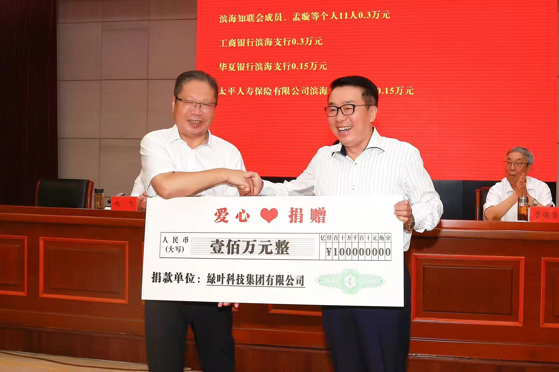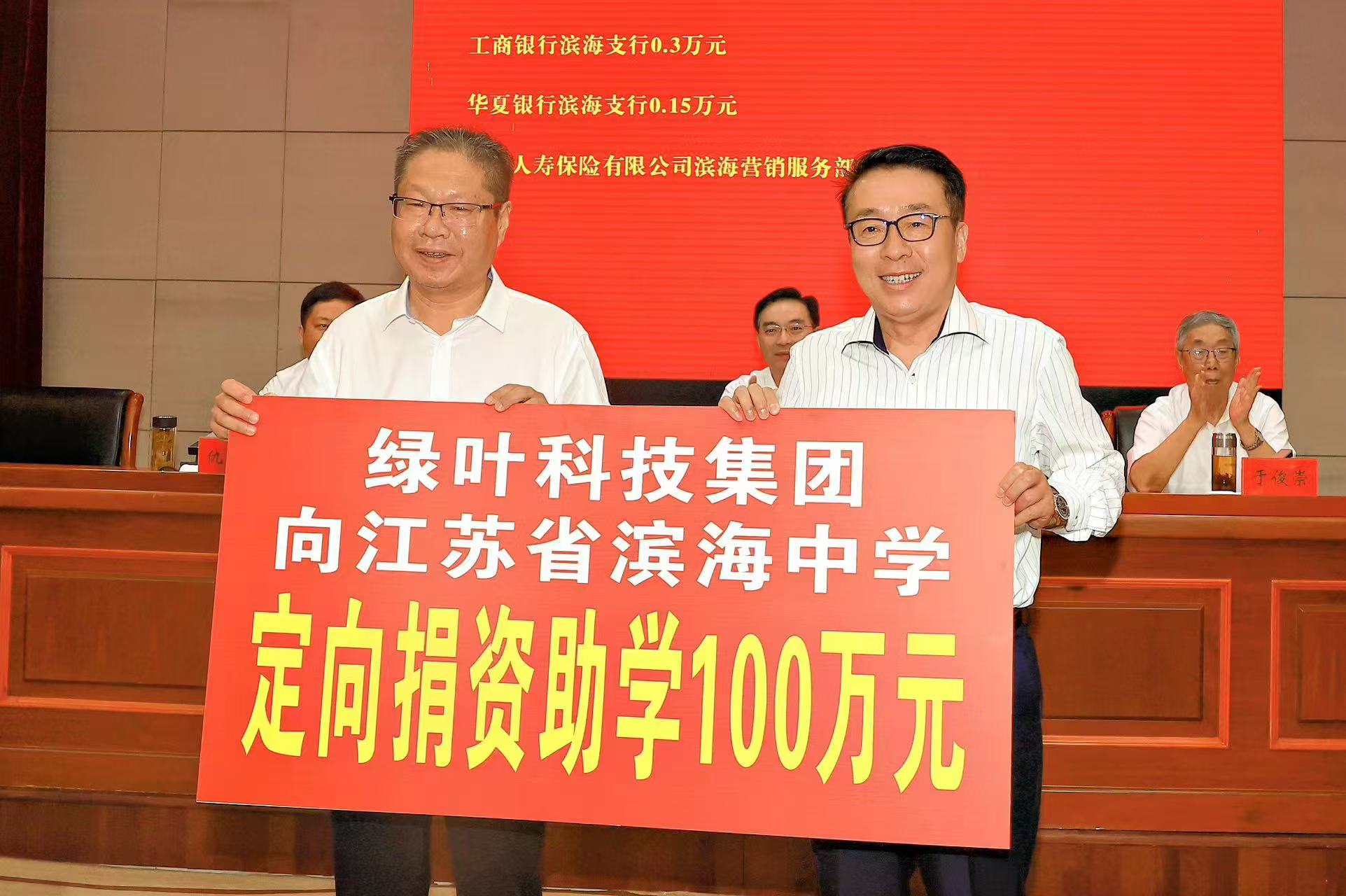 滨海县慈善总会常务副会长徐寿文宣读《关于成立滨海县慈善总会教育分会的通知》和《关于滨海县慈善总会教育分会的任命通知》。滨海县慈善总会会长郑成铨,滨海县慈善总会教育分会会长、滨海县教育局局长杨光共同为滨海县慈善总会教育分会揭牌。会议审议通过《滨海县慈善总会教育分会基金管理办法》。绿叶科技集团董事长徐建成宣读倡议书,号召社会各界共同关注和支持滨海县教育事业。徐建成首先向江苏省滨海中学定向捐赠100万元,祝贺滨中学生李中翔考上清华大学,以实际行动鼓励全校师生再创佳绩,再向滨海县慈善总会教育分会捐赠100万元。滨海县慈善总会教育分会会长、滨海县教育局局长杨光接受捐赠。爱心企业积极响应倡议,全力支持滨海教育事业。