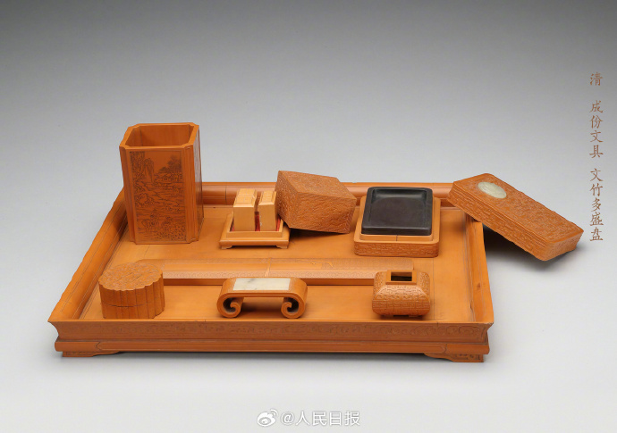 开学在即,你的文具准备好了吗?这套文竹多盛盘,内盛竹雕笔筒、印泥盒、印章、水丞、墨床、石砚盒、臂搁七件文具,分别雕刻山水、夔纹、回纹等装饰。要开学了,愿广大学子,文思澎湃如泉涌,才学猛进如破竹!(来源:故宫博物馆微博)