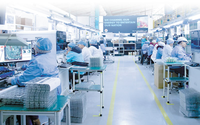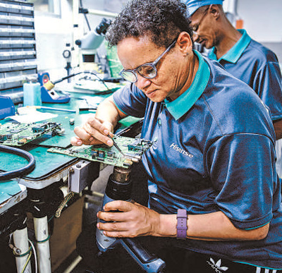 海信南非工业园电视工厂的电路板生产线上,当地工人们正在作业。 |