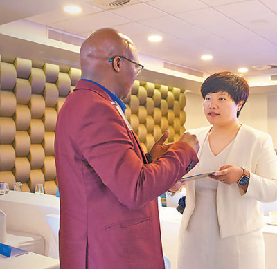 南非西开普省与山东省政府商务交流会议现场,刘巍(右)在和南非本土企业代表交流。 |