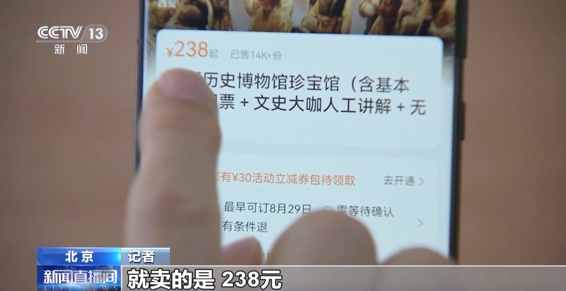 总台记者:在携程上输入陕西历史博物馆,卖的是陕西历史博物馆珍宝馆含基本馆的门票加文史大咖讲解。珍宝馆的门票官网上是免费的,但在这个平台上,加了一个人工讲解,就卖238元。