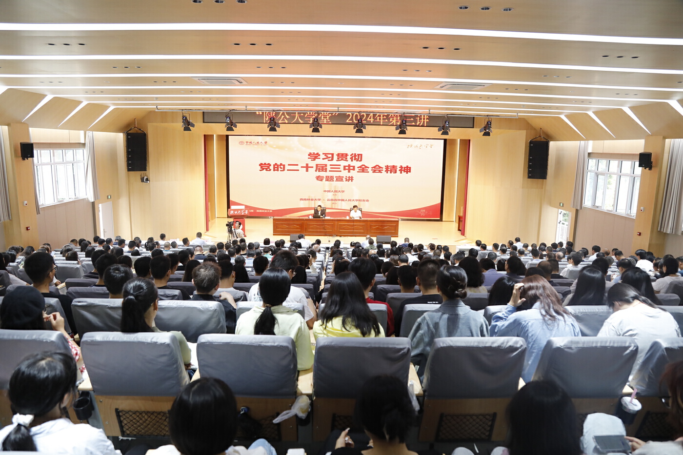 8月31日,中国人民大学“陕公大学堂”2024年第三讲在西南林业大学开讲。中国人民大学吴玉章特聘教授、博士生导师裴建锁教授作为主讲人,为西林师生带来了一场学习贯彻党的二十届三中全会精神的专题宣讲会。
