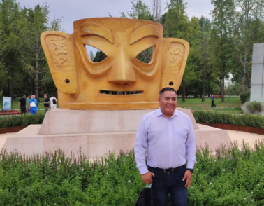 墨西哥电视六台台长胡里奥·塞萨尔·加西亚抢先一步与“商周大金面具”雕塑留影(周斌摄)
