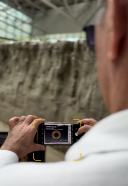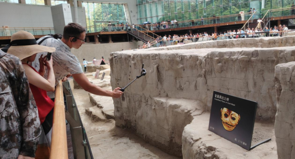 在遗迹馆区,中外记者通过木梯近距离观察大型祭祀活动场所的发掘地,亲身感受3000年前古蜀王国气势恢宏的滨河祭祀场面,与众多珍贵文物的出土原址面对面。