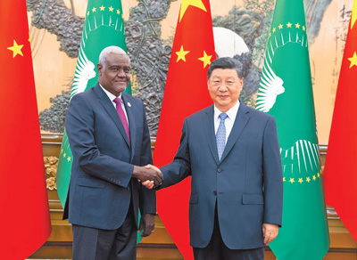 9月3日上午,国家主席习近平在北京人民大会堂会见来华出席中非合作论坛北京峰会的非盟委员会主席法基。 |