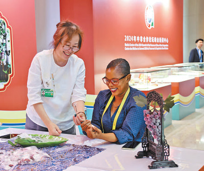 9月4日,在2024年中非合作论坛峰会新闻中心,非洲记者体验玻璃葡萄制作技艺。 |