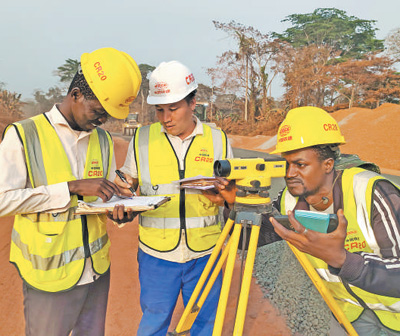 喀麦隆吕—曼金公路是该国首都雅温得连接北部各地区的重要通道,其中96.7千米管段由中铁二十局承建。图为中喀两国员工对施工路面进行测量放样。 |