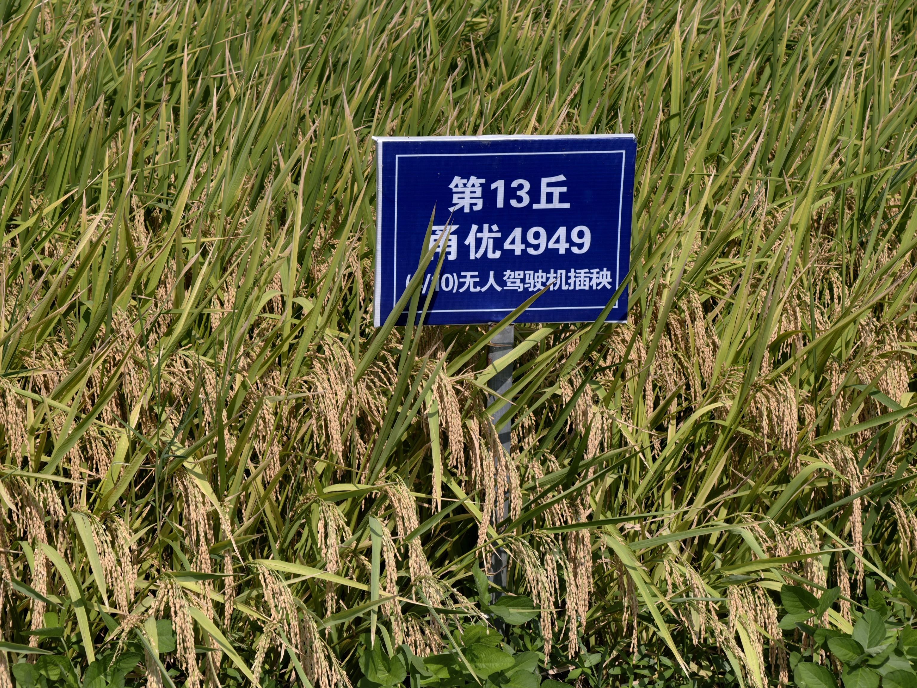 等待收割的再生稻稻穗低垂,它们由无人驾驶插秧机机插,无人驾驶收割机收割,做到“种收同轨”
