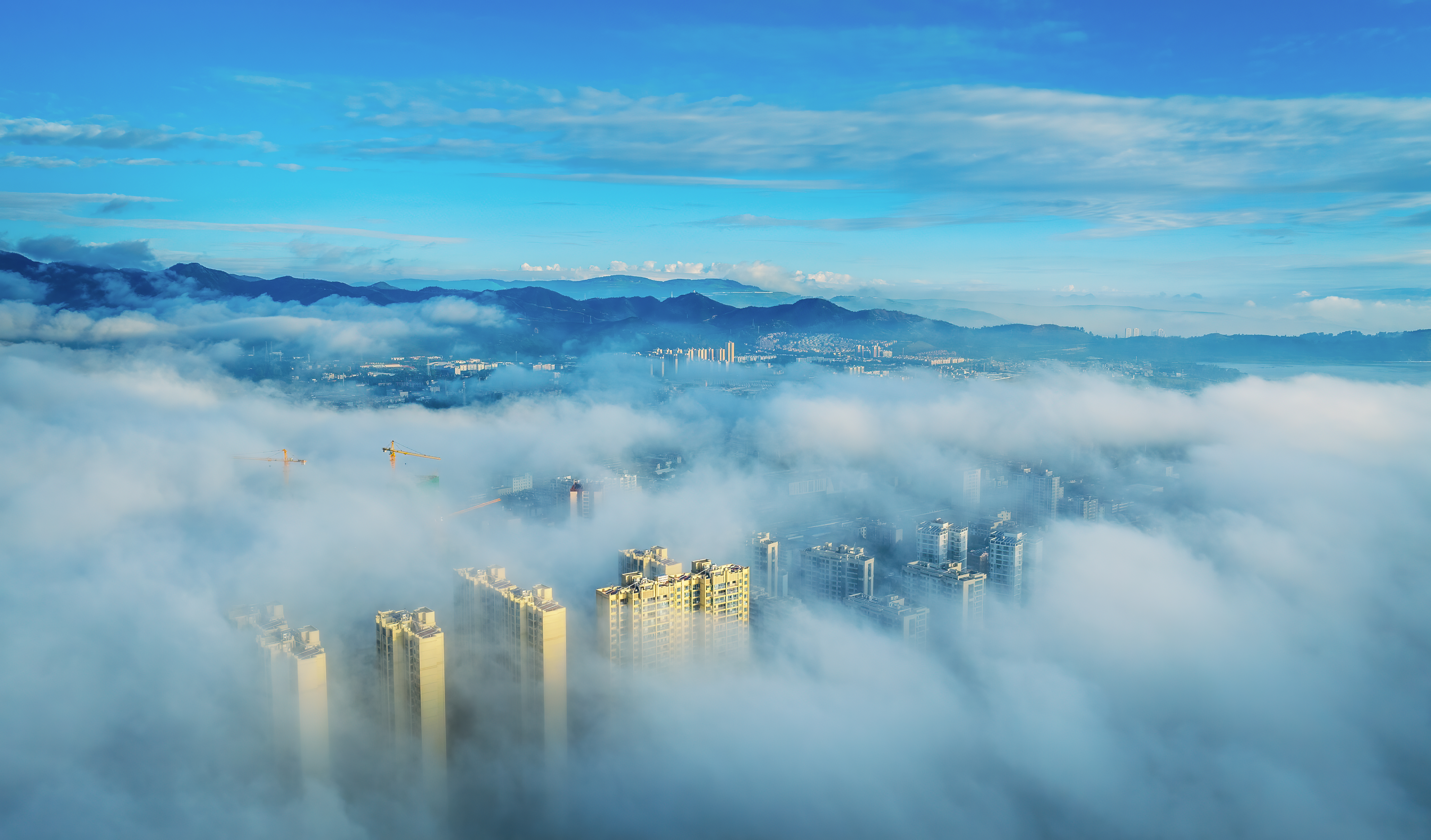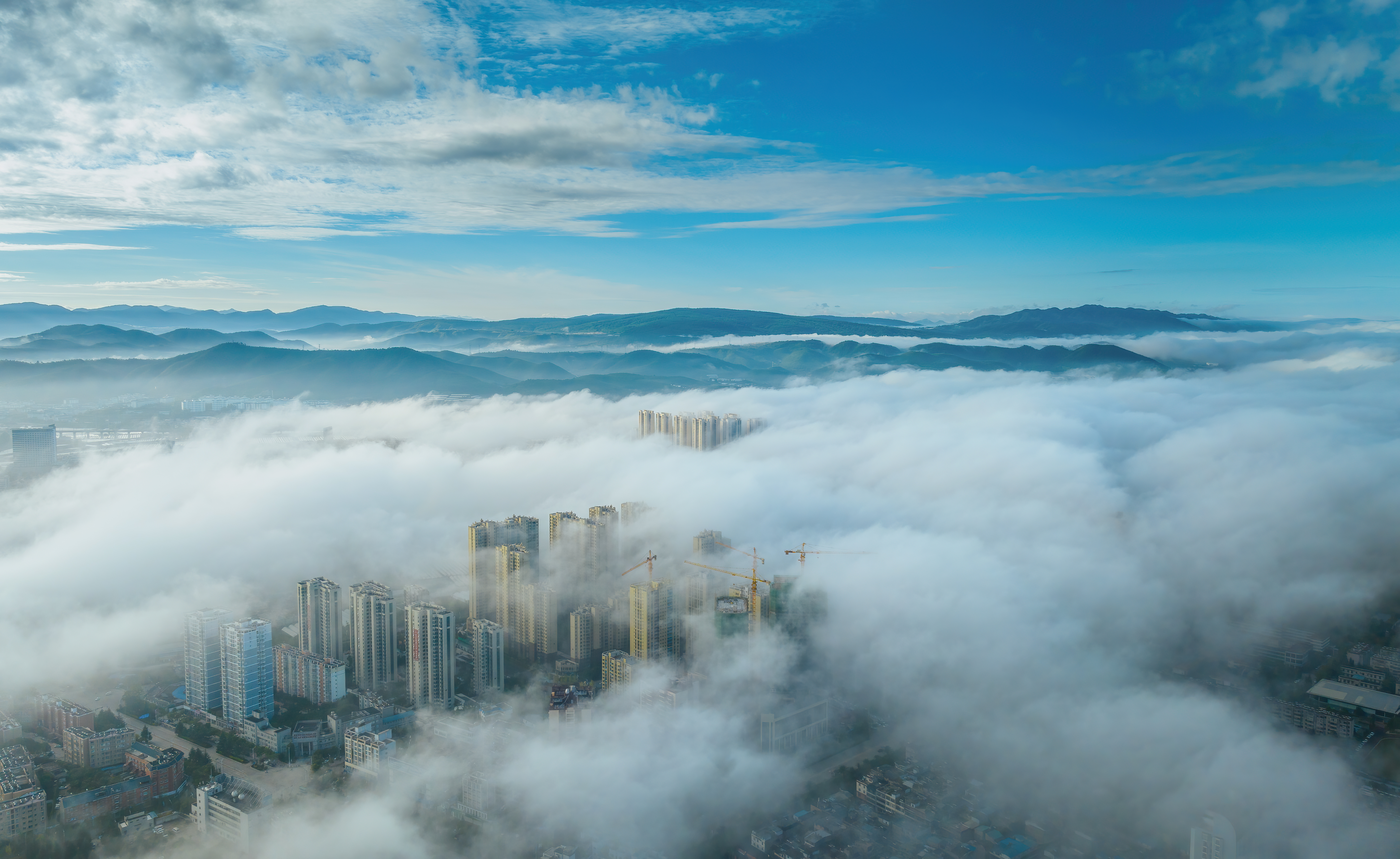近日,位于滇池南岸的昆明市晋宁区昆阳城出现壮美的云海景观,晨光破晓,翻腾的云海如波涛汹涌的大海,山峦在云海中若隐若现,洁白云海在城市的天际线勾勒出一幅流动的水墨画,整座城市像是被披上了一层神秘而梦幻的纱幔,宛若仙境。