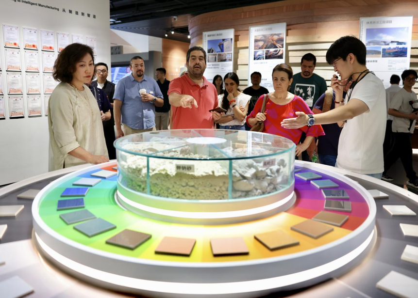 一幅幅笔触细腻、栩栩如生的画作与墙壁融为一体,一块块颜色各异、细腻精致的瓷砖讲述着中国不同地域的文化故事……9月5日,2024“一带一路”媒体合作论坛拉美媒体采访团走进位于广东佛山的新明珠集团冠珠瓷砖展厅,见证瓷砖和岩板上中国风韵,感受中国智造与传统文化碰撞出的火花。