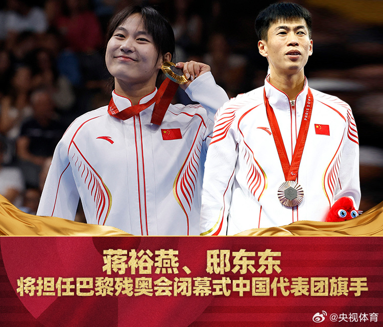 巴黎残奥会官方宣布,游泳运动员蒋裕燕、田径运动员邸东东将担任中国残奥代表团闭幕式旗手。