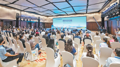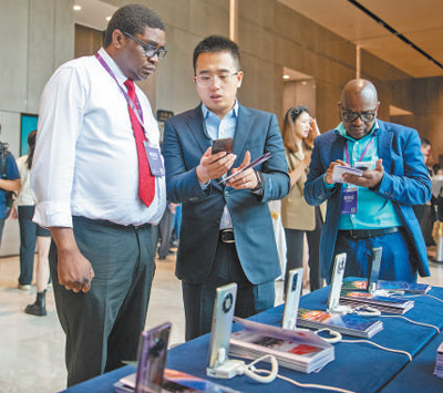 会议间隙,与会嘉宾在了解人民日报英文客户端。 |