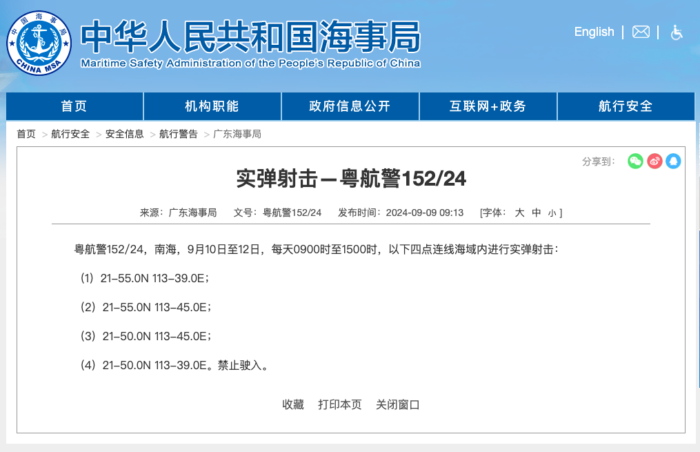 据中国海事局网站消息,广东海事局发布航行警告,9月10日至12日,每天9时至15时,南海部分海域进行实弹射击,禁止驶入。