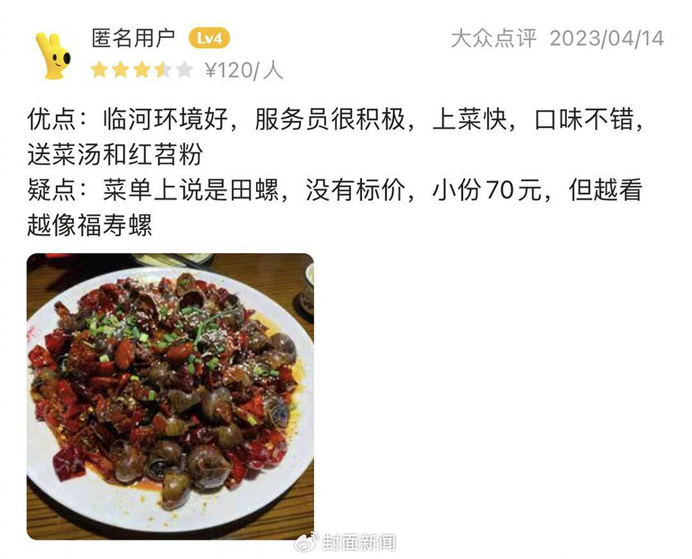 网友质疑,是否存在欺瞒顾客的情况。若是无经验的人无法辨别田螺和福寿螺而误食,这是否会对顾客身体健康造成极大的潜在危险和伤害?