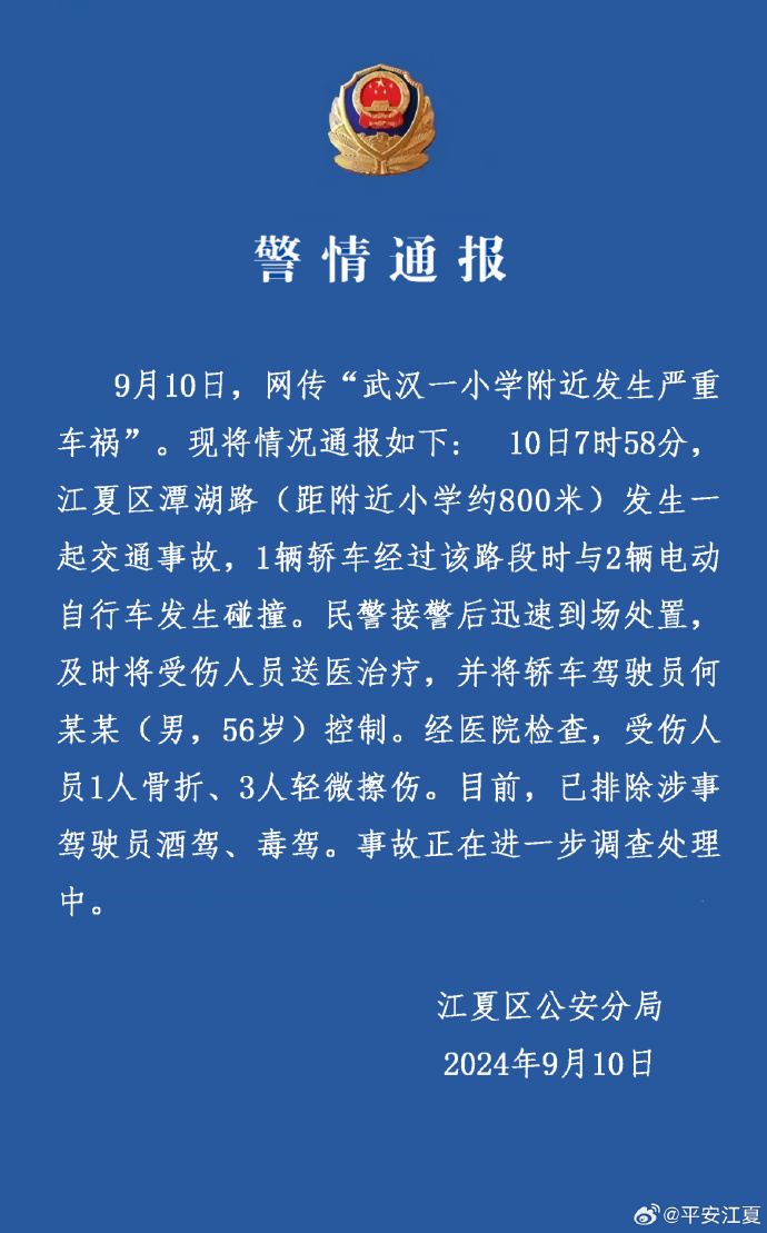 9月10日,湖北省武汉市公安局江夏区分局通报:10日7时58分,江夏区潭湖路(距附近小学约800米)发生一起交通事故,1辆轿车经过该路段时与2辆电动自行车发生碰撞。民警接警后迅速到场处置,及时将受伤人员送医治疗,并将轿车驾驶员何某某(男,56岁)控制。经医院检查,受伤人员1人骨折、3人轻微擦伤。目前,已排除涉事驾驶员酒驾、毒驾。事故正在进一步调查处理中。