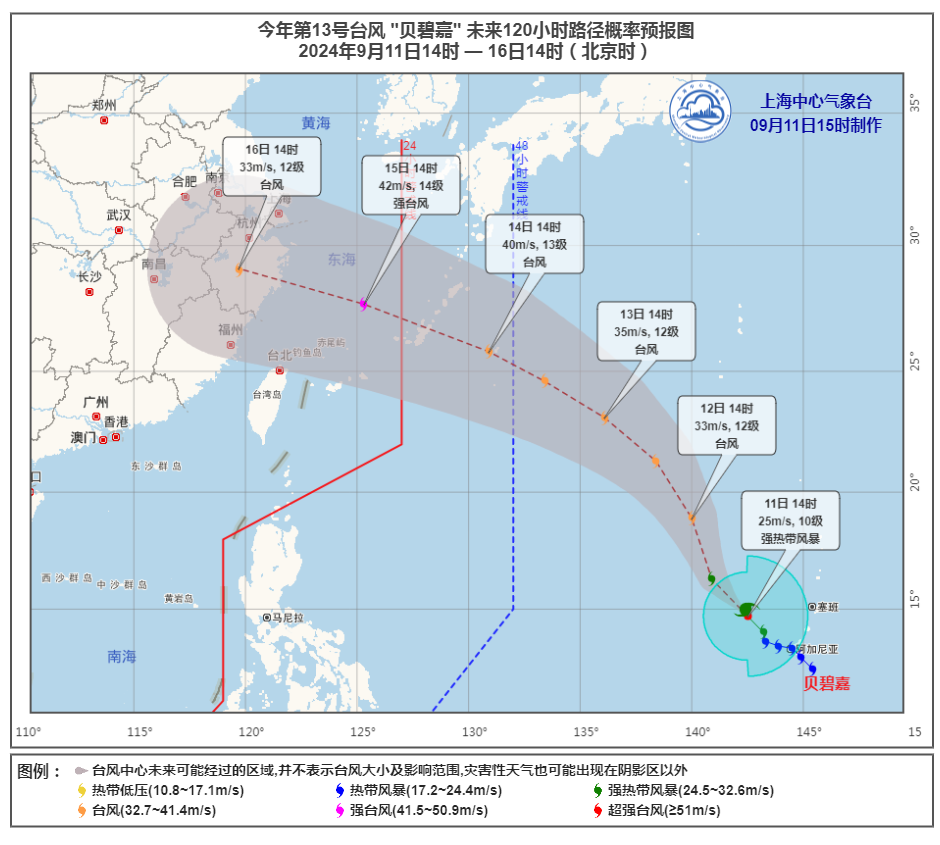 今年第13号台风“贝碧嘉”昨天(10日)夜间在西北太平洋洋面上生成,未来将向西北方向移动,强度逐渐加强。预计15日前后进入我国东海,随后逐渐向我国华东沿海靠近,可能在浙江沿海登陆。15-16日或对上海市造成风雨影响。