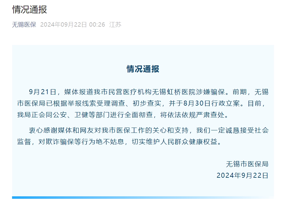 江苏无锡市医保局9月22日通报:9月21日,媒体报道我市民营医疗机构无锡虹桥医院涉嫌骗保。前期,无锡市医保局已根据举报线索受理调查、初步查实,并于8月30日行政立案。目前,无锡市医保局正会同公安、卫健等部门进行全面彻查,将依法依规严肃查处。