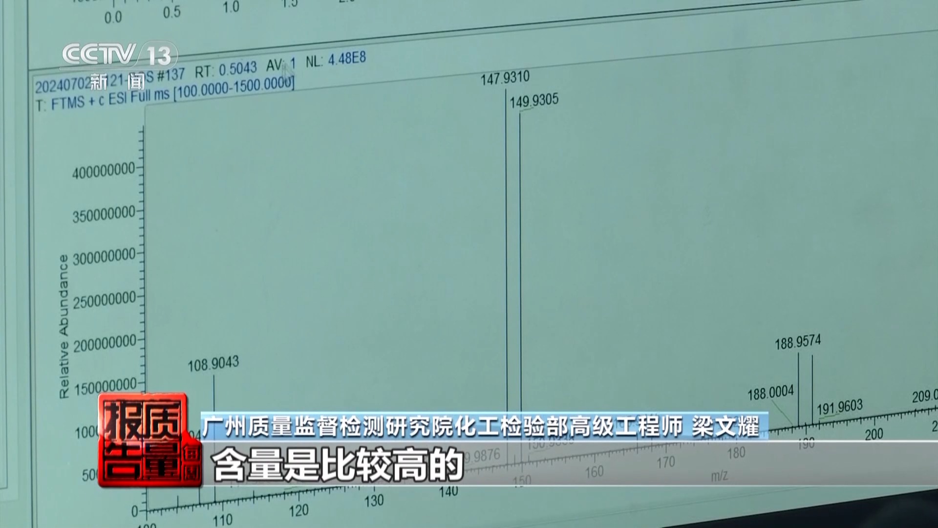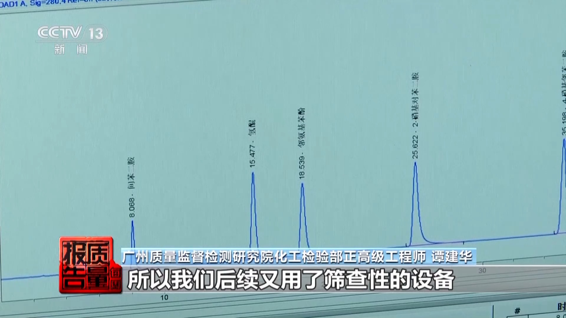 广州质量监督检测研究院化工检验部正高级工程师 谭建华:我们要打破自己的思维方式了,我们要寻求一些可能更高端的方法,或者一些综合性的分析策略,所以我们后续又用了筛查性的设备,对可疑的组分进行非靶向性筛查。