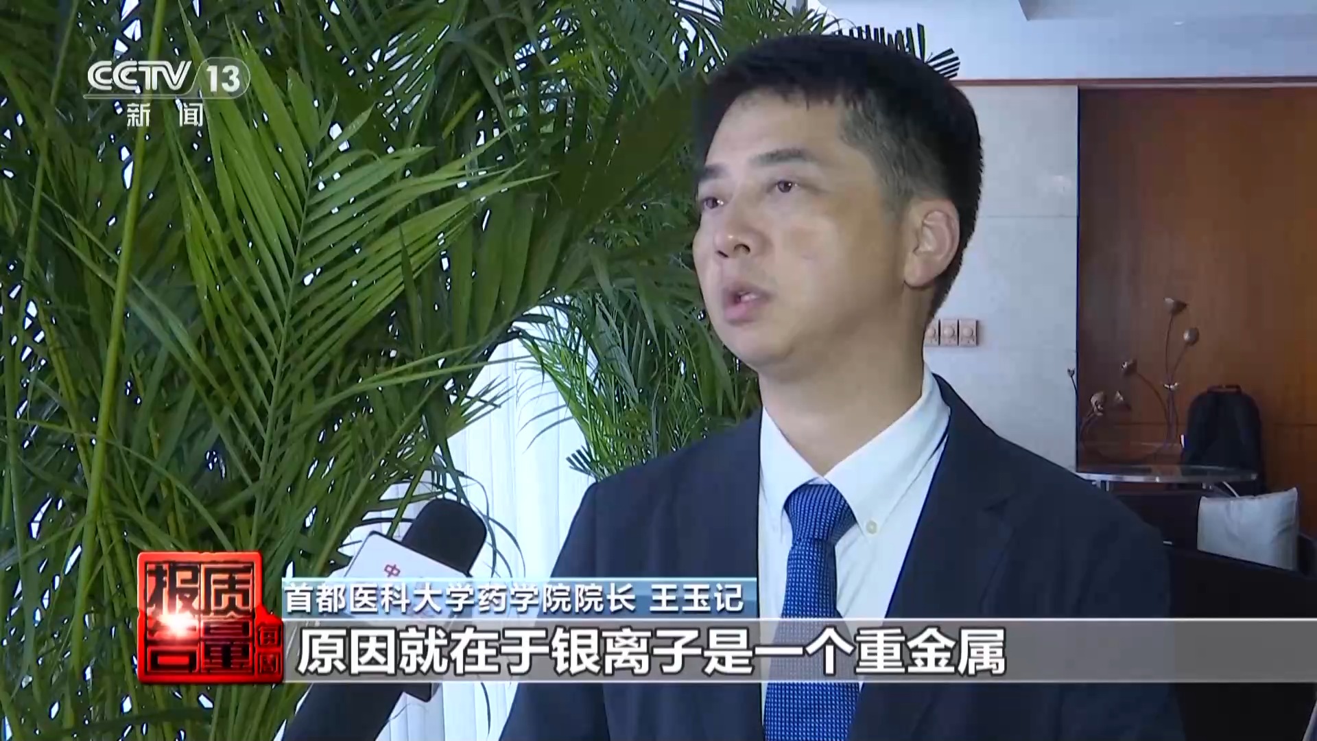 首都医科大学药学院院长 王玉记:硝酸银的问题就是它对于黏膜的刺激性非常强。比如说接触到角膜,接触到我们的呼吸道,吸入到肺里面,进入到人体, 对于我们的整个细胞体系、黏膜都是有很大危害的,原因就在于银离子是重金属,所以我们在很多情况下是要避免接触硝酸银这种物质的。