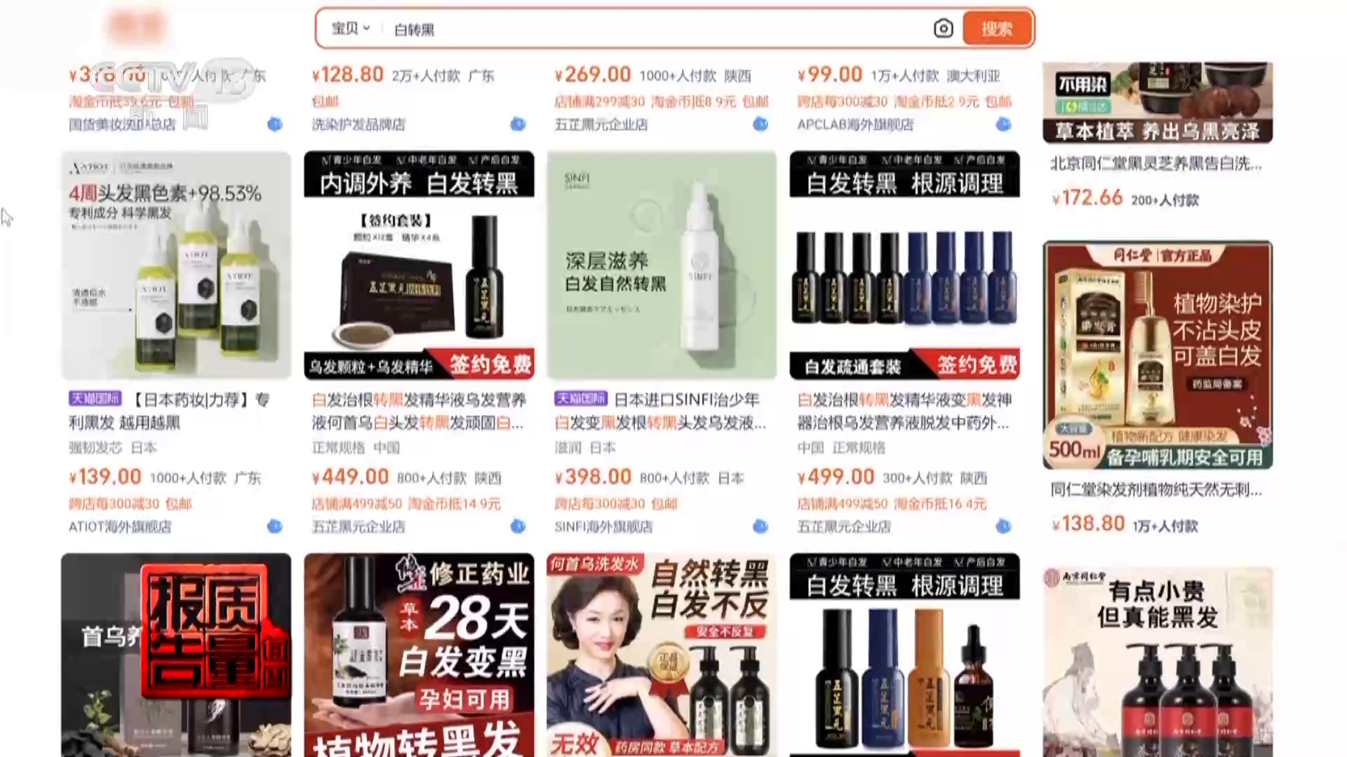 打着自然“白转黑”的幌子,卖高价误导消费者,而记者调查发现,目前在行业内,短时间内促进白发自然转黑的化妆品根本不存在。