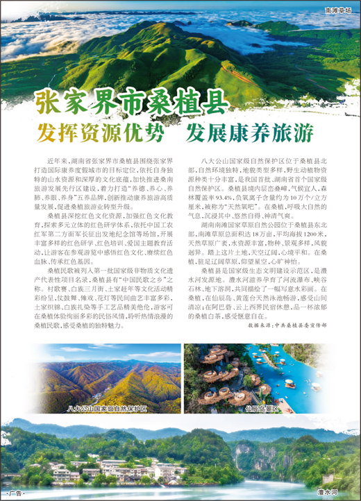 近年来,湖南省张家界市桑植县围绕张家界打造国际康养度假城市的目标定位,依托自身独特的山水资源和深厚的文化底蕴,加快推进桑南旅游发展先行区建设,着力打造“养德、养心、养肺、养眼、养身”五养品牌,创新推动康养旅游高质量发展,促进桑植旅游业转型升级。