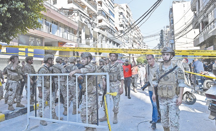 26日,贝鲁特南郊遭以色列空袭后,黎巴嫩安全部队封锁该区域。(法新社)
