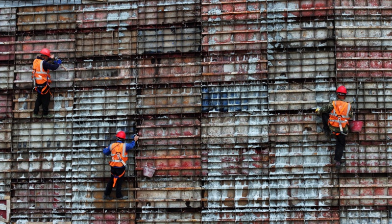 卡拉水电站建设者“攀岩”在上游围堰边墙施工。蒋露龄 摄