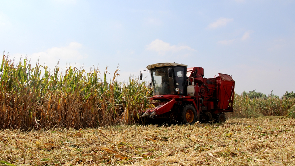 当前,永城市秋作物已全面进入收获期。9月29日,永城市侯岭街道张井村亚飞种植专业合作社的千亩玉米田里,3台玉米联合收割机开足马力作业。伴随着机声轰鸣,一排排玉米植株连秆带穗“吞”进仓内,一派繁忙景象。