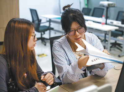 西北工业大学的工大翱翔众创空间是一个面向学生创新创业团队和初创企业提供孵化服务的平台,目前已培育注册学生企业10余家。图为在工大翱翔众创空间,学生创新创业团队讨论技术问题。 |