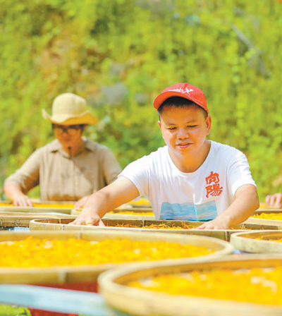 福建省南安市向阳乡采取“党支部+合作社+农户”的模式,大力发展中草药种植,吸引返乡青年创业。图为在向阳乡坑头村,返乡青年、新农人林祥桂和村民晾晒采摘好的黄花菜。 |