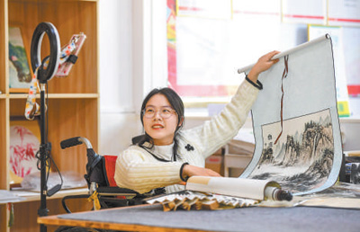 江西省宜春市铜鼓县为残障人士提供技能培训、创业指导等服务。残障人士冯欢在当地政府和残联的帮助下,创业成立了绘画工作室。图为冯欢在工作室直播销售绘画作品。 |